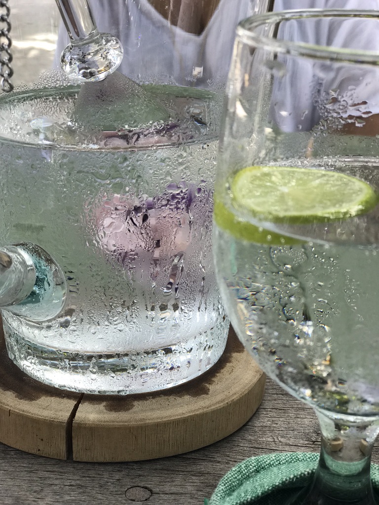 It doesn’t matter if you don’t believe that crystals and quartz have healing properties, the juxtaposition of the crystal rod tethered to the jug by a delicate stainless chain and the faded wood tables and chairs creates a rustic luxury that evokes calm in the most fastidious soul by signaling you can kick up your heals but not to worry everything is premium.