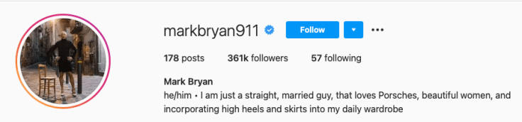 Mr. Bryan (he/him) tells us he is “just a straight, married guy, that (sic.) loves Porsches, beautiful women, and incorporating high heels and skirts into [his] daily wardrobe.”